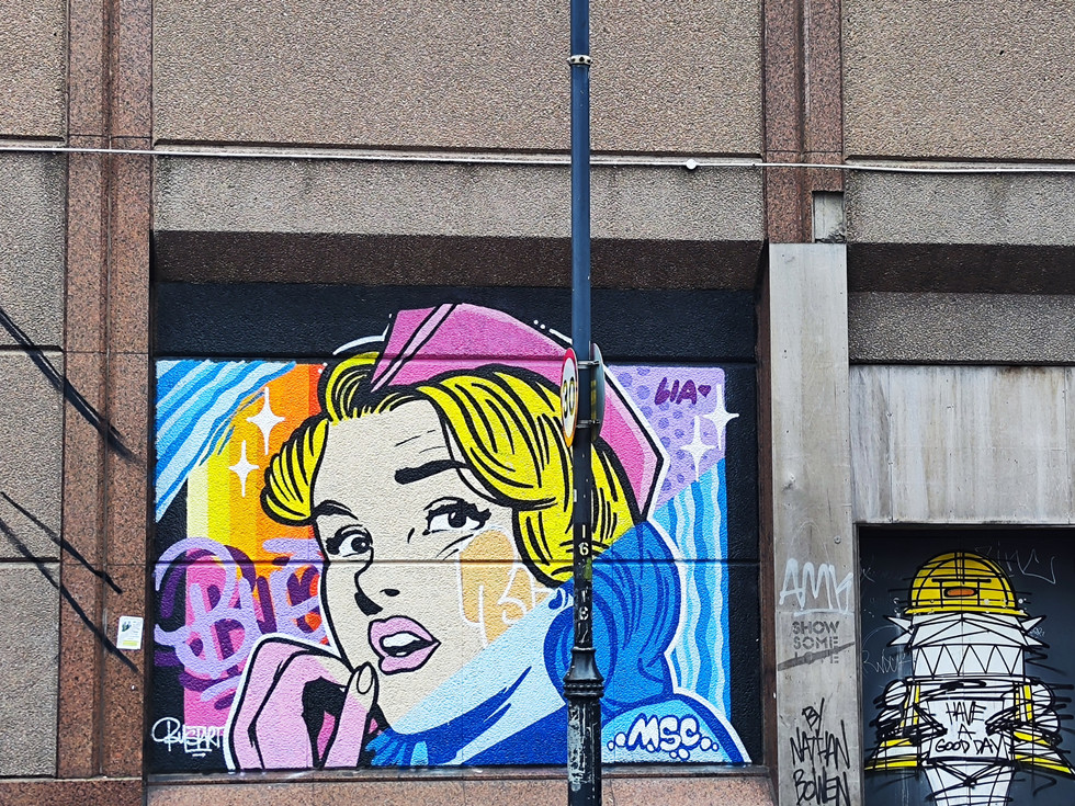 A séf című (vagy a Homáros edény) falfestményt a "szakmában" az egyik legnagyobbnak tartott ausztrál művész - SMUG - készítette 2016-ban. Egy, a részleteket gazdagon ábrázoló technikával készült férfi alak homárt tart a kezébe. A képemről a homár lemaradt, mert a falfestmény alsó része elé mindenféle bódékat állítottak és a homár már alig látszott.