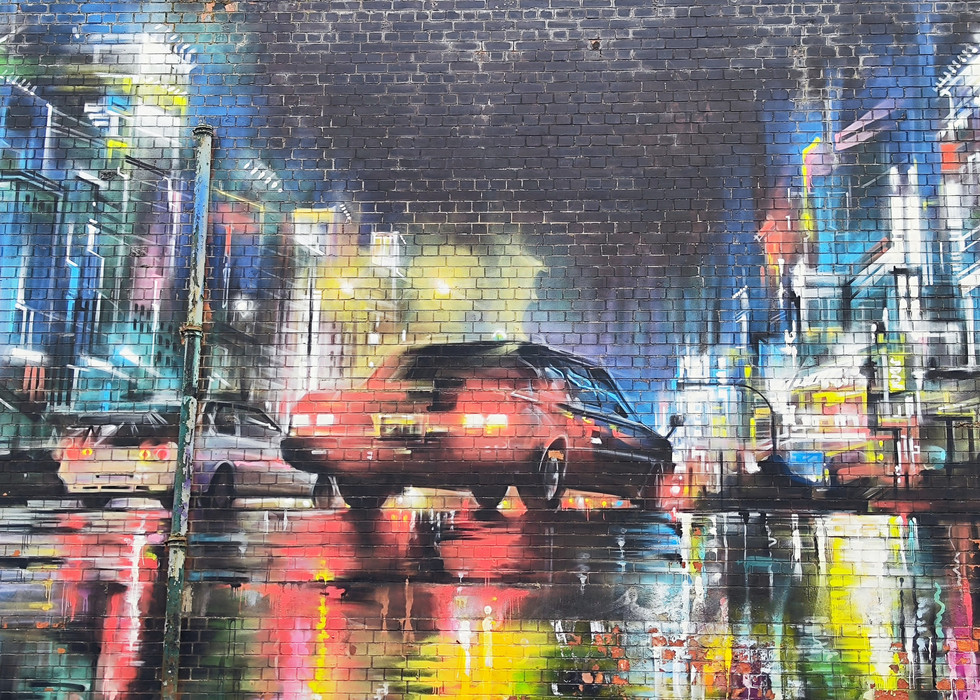 Dank készítette (Dan Kitchener) a következő falfestményt, amely eső áztatta, macskaköves utcát ábrázol. Néhányan a Szárnyas fejvadász film hangulatát vélik megelevenedni az épület falán. Nekem Amerika és egy Sunny Dinner jutott az eszembe, de a művészet szépsége, hogy mindenki a saját szemüvegén keresztül látja és értelmezheti az alkotásokat.