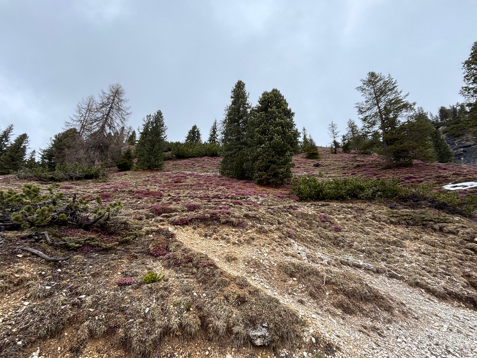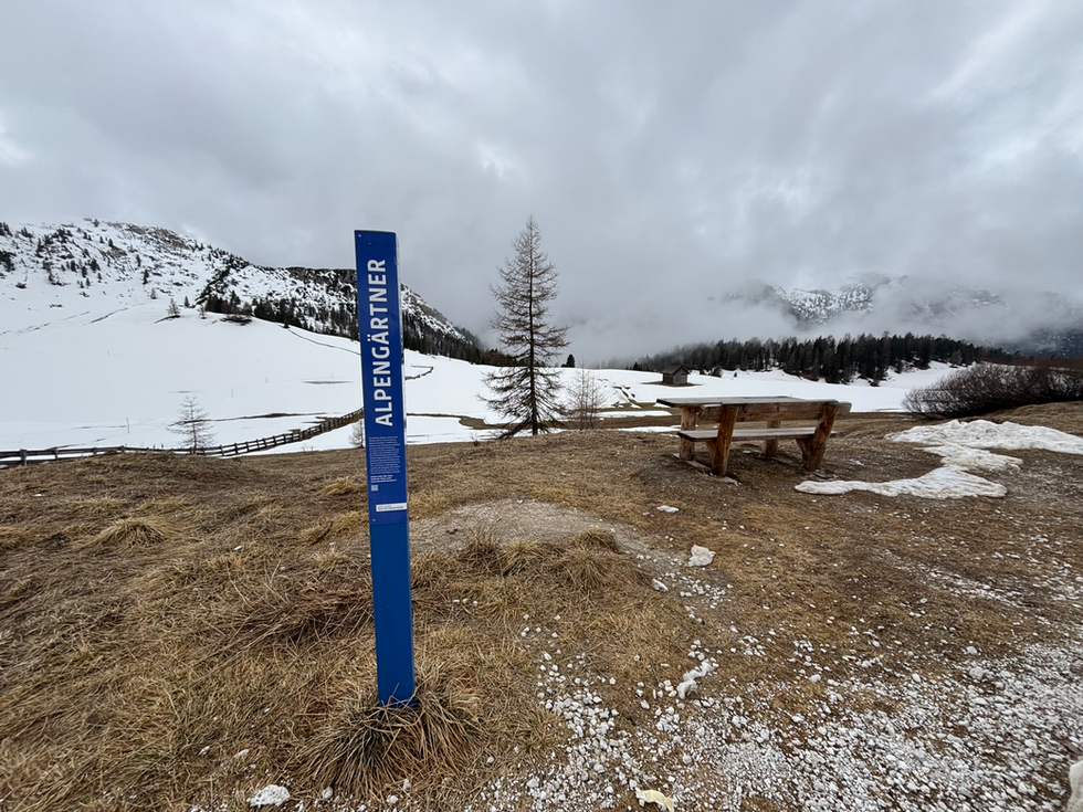 A parkolótól a Plätzwiese fogadó és a Hotel Gaisl az első támpont. Mivel mindent hó fedett, a sík, murvás úton haladtunk tovább, egészen a 2040 m magasan fekvő Dürrenstein hüttéig. A tavasz ebben a magasságban még csak bontogatta szárnyát. A fennsík egy részén már elolvadt a hó, de a táj a harsogó zöld helyett rozsdabarna színt öltött, keveredve az alpesi erikák lila foltjaival. Az eget és a napot felhők takarták, a hófödte csúcsok csak néha-néha bukkantak ki a szürkeségből.