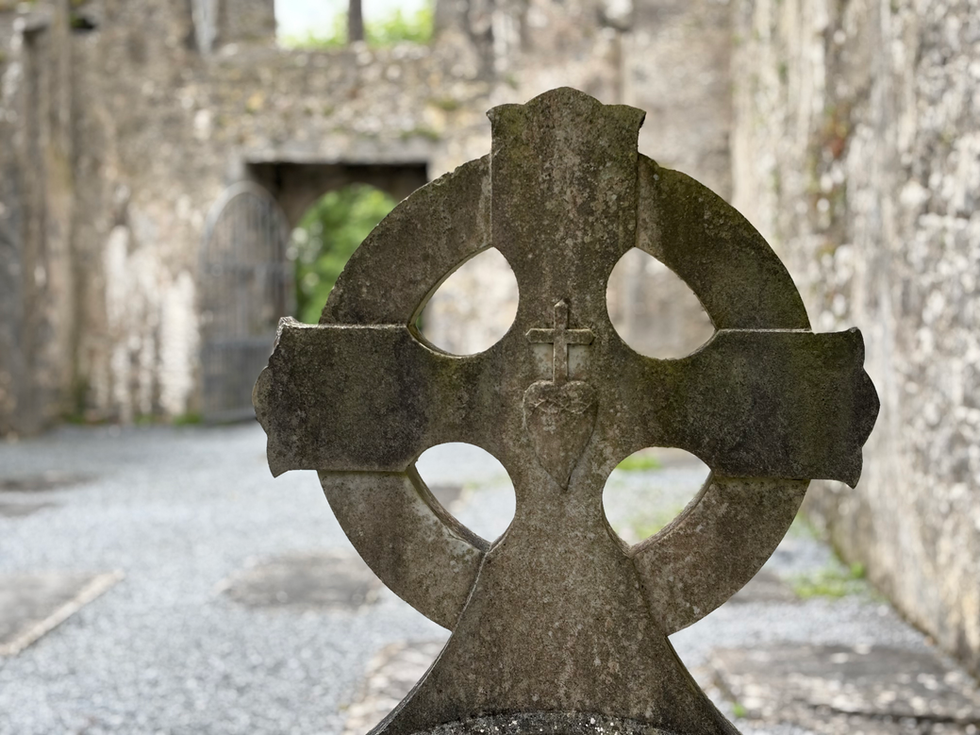 A Quin apátság romjait a város főutcájáról letérve, egy kis bolt utáni parkolóból közelítettük meg. Az égen a néhol komor felhők és a haragos zöld mező között ott állt a történelem viharaival dacosan szembeszálló templom.