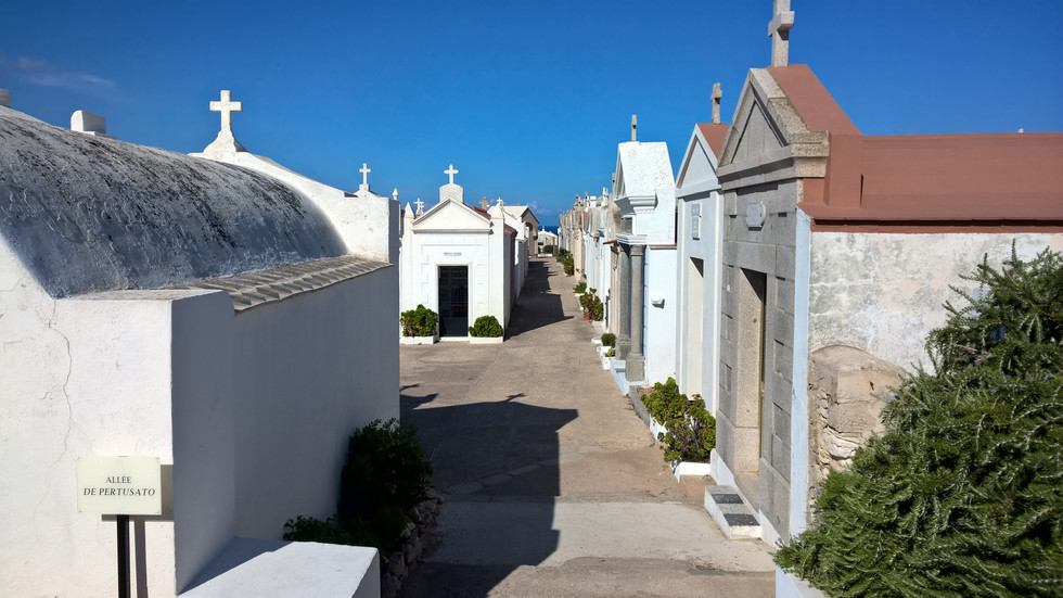 A Bosco fennsíkon, nem messze a Szent Ferenc templomtól található a Campu Santu, Bonifacio temetője. Tudom, hülye hasonlat, de első ránézésre a balatonfüredi görög falu jutott eszembe, amikor megláttam. Mindemellett, hogy lágyan simul a környezetébe, valahogy nem ideillőnek éreztem. A kripták között sétálva az ember arra számított, hogy kinyílik az ajtajuk és megjelennek lakóik.